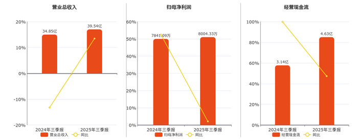 公司营业总收入为39.54亿元。归母净利润为8004.33万元。经营活动现金净流入为4.63亿元。