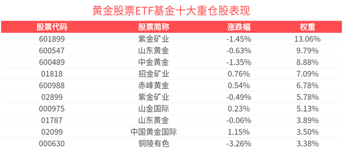 数据显示,截至2025年9月30日,中证沪深港黄金产业股票指数(931238)前十大权重股分别为紫金矿业(601899)、山东黄金(600547)、中金黄金(600489)、招金矿业(01818)、赤峰黄金(600988)、山金国际(000975)、紫金矿业(02899)、山东黄金(01787)、铜陵有色(000630)、湖南黄金(002155),前十大权重股合计占比68.2%。