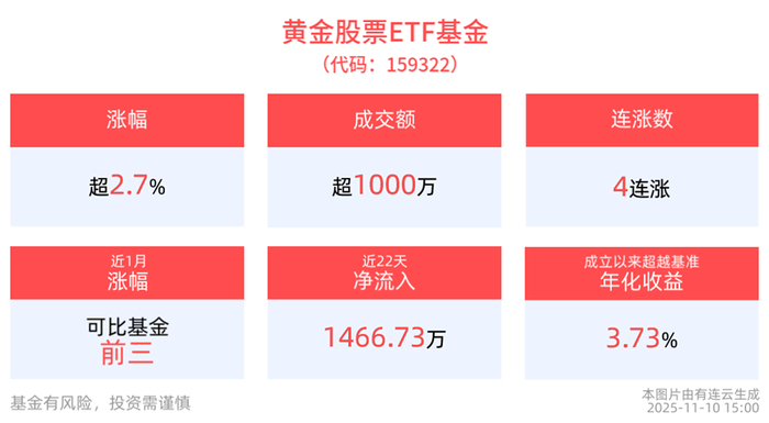 实现4连涨。最新价报1.59元。拉长时间看,截至2025年11月10日,黄金股票ETF基金近1周累计上涨2.45%,涨幅排名可比基金3/6。