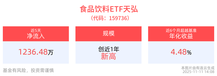 拉长时间看,截至11月10日,食品饮料ETF天弘(159736)最新规模达58.24亿元,创近1年新高。
