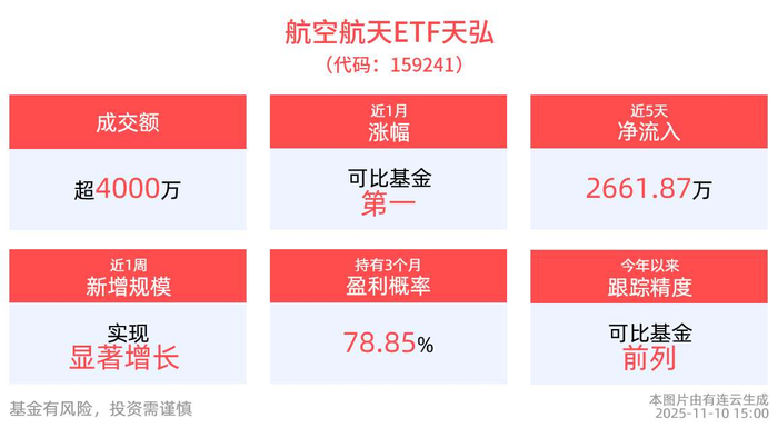 截至11月10日,航空航天ETF天弘(159241)近1周规模增长2938.64万元,实现显著增长。
