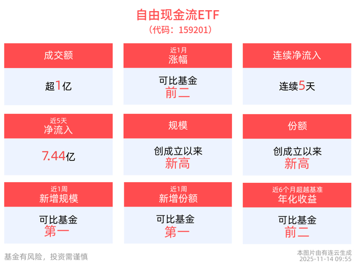 截至11月13日,自由现金流ETF近6月净值上涨25.14%。从收益能力看,截至2025年11月13日,自由现金流ETF自成立以来,最高单月回报为7%,最长连涨月数为6个月,最长连涨涨幅为22.69%,涨跌月数比为7/1,上涨月份平均收益率为3.2%,月盈利百分比为87.5%,月盈利概率为82.61%,历史持有6个月盈利概率为100%。截至2025年11月13日,自由现金流ETF近6个月超越基准年化收益为10.07%。