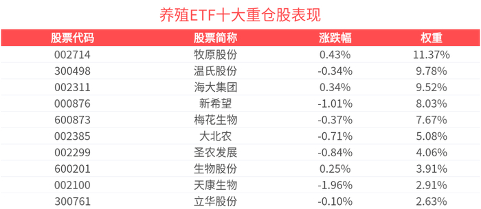 数据显示,截至2025年10月31日,中证畜牧养殖指数(930707)前十大权重股分别为牧原股份(002714)、温氏股份(300498)、海大集团(002311)、梅花生物(600873)、新希望(000876)、大北农(002385)、生物股份(600201)、圣农发展(002299)、天康生物(002100)、立华股份(300761),前十大权重股合计占比65.58%。
