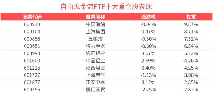 自由现金流ETF紧密跟踪国证自由现金流指数,数据显示,截至2025年10月31日,国证自由现金流指数前十大权重股分别为中国海油、上汽集团、五粮液、格力电器、洛阳钼业、中国铝业、陕西煤业、上海电气、厦门国贸和正泰电器,前十大权重股合计占比54.79%。(以上所列股票仅为指数成份股,无特定推荐之意)