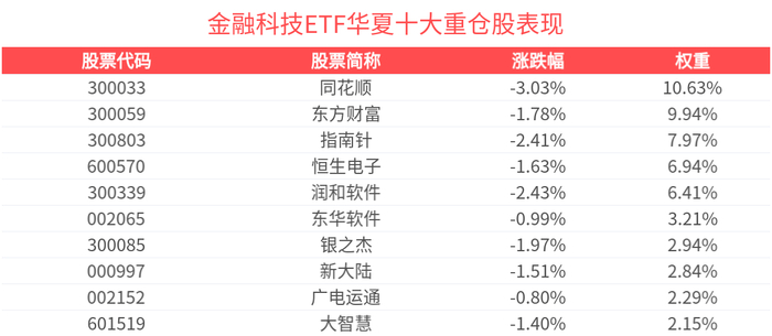 金融科技ETF华夏紧密跟踪中证金融科技主题指数,截至2025年11月28日,指数前十大权重股分别为同花顺、东方财富、恒生电子、指南针、润和软件、东华软件、新大陆、银之杰、广电运通、四方精创,前十大权重股合计占比53.31%。(以上所列股票仅为指数成份股,无特定推荐之意)
