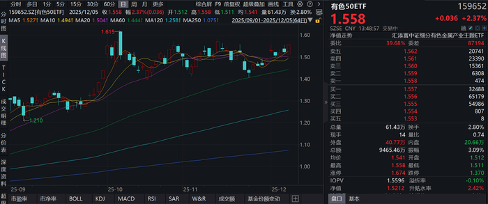 截至2025年12月5日 13:48,中证细分有色金属产业主题指数(000811)强势上涨2.51%,成分股中孚实业(600595)上涨9.99%,南山铝业(600219)上涨8.76%,神火股份(000933)上涨6.47%,云铝股份(000807),江西铜业(600362)等个股跟涨。有色50ETF(159652)上涨2.37%, 冲击3连涨。最新价报1.56元。拉长时间看,截至2025年12月4日,有色50ETF近1周累计上涨4.10%。(以上所列股票仅为指数成份股,无特定推荐之意)