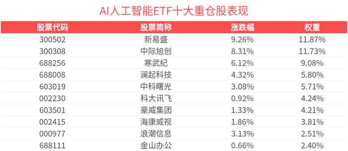 数据显示,截至2025年11月28日,中证人工智能主题指数(930713)前十大权重股分别为中际旭创(300308)、新易盛(300502)、寒武纪(688256)、中科曙光(603019)、澜起科技(688008)、科大讯飞(002230)、海康威视(002415)、豪威集团(603501)、金山办公(688111)、浪潮信息(000977),前十大权重股合计占比63.92%。(以上所列股票仅为指数成份股,无特定推荐之意)