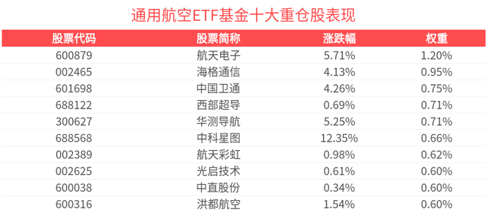 数据显示,截至2025年11月28日,中证通用航空主题指数(931855)前十大权重股分别为航天电子(600879)、海格通信(002465)、中科星图(688568)、中国卫通(601698)、华测导航(300627)、航天彩虹(002389)、西部超导(688122)、中直股份(600038)、光启技术(002625)、洪都航空(600316),前十大权重股合计占比40.68%。(以上所列股票仅为指数成份股,无特定推荐之意)