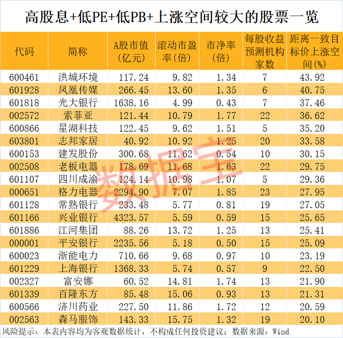 进一步从估值与市场表现分析,这批经过筛选的股票中,多股具备低市盈率、低市净率的特征,且未来上涨空间充足。据数据宝统计,截至10月27日,滚动市盈率(PE)低于20倍,市净率(PB)低于2倍,且收盘价较机构一致预测目标价上涨空间超20%的股票有20只。洪城环境、凤凰传媒、光大银行、索菲亚、星湖科技等上涨空间靠前。