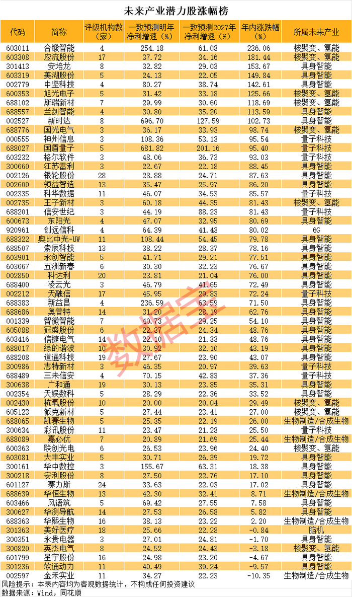 部分公司的成长性值得期待。据数据宝统计,3家及以上机构评级个股中,有59只个股一致预测明年及2027年净利增速均超20%。其中国盾量子、新时达两只个股未来两年机构一致预测净利增速均超100%,合锻智能、神州信息、华中数控等个股净利增速均超50%。