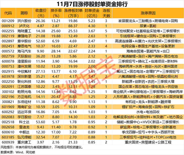 以封单金额计算,20股封单资金均超1亿元,洪兴股份、泸天化、海陆重工封单资金居前,分别为5.23亿元、4.3亿元、3.67亿元。
