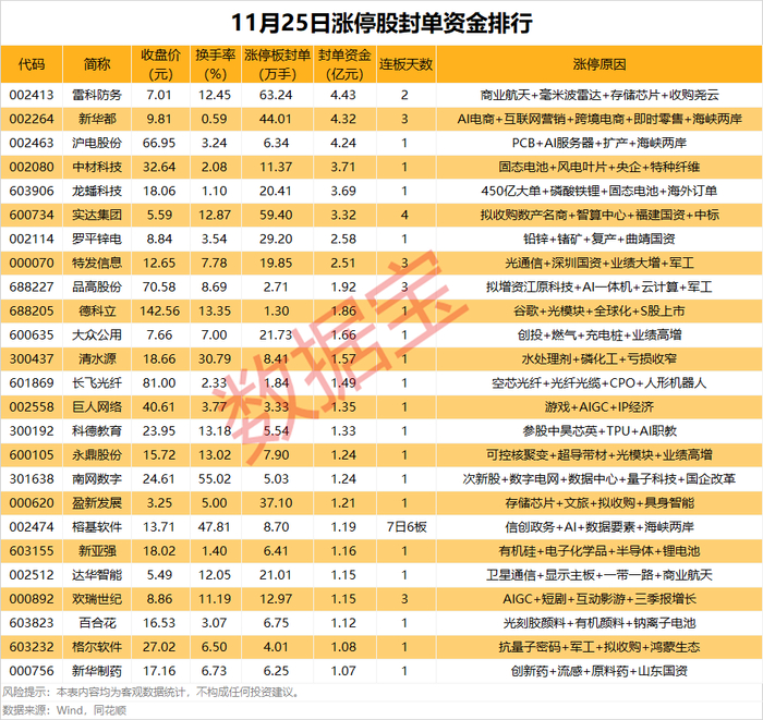 以封单金额计算,29股封单资金均超1亿元,雷科防务、新华都、沪电股份封单资金居前,分别为4.43亿元、4.32亿元、4.24亿元。
