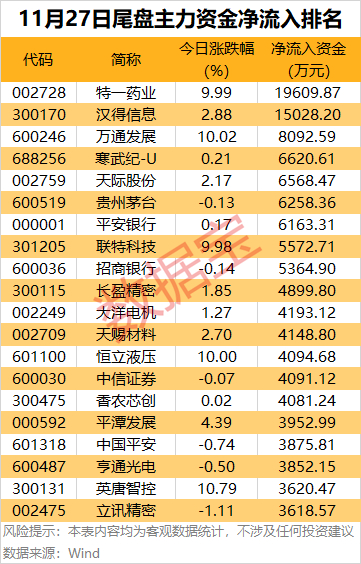 个股方面,特一药业、汉得信息尾盘主力资金净流入均超1亿元,居前。