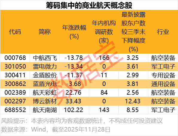 从筹码情况来看,商业航天概念股中,以最新披露的股东户数与三季末对比,7只个股的股东户数有所下降,5股的股东户数降幅超过3%,包括博云新材、航天南湖、蓝盾光电等。