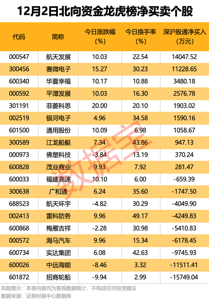 今日龙虎榜现身个股中,10股获北向资金净买入。净买入居前的是航天发展、赛微电子,均超1.1亿元。