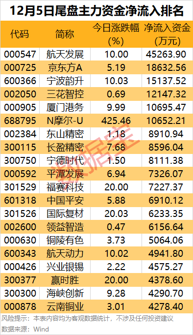 航天发展涨停,尾盘主力资金净流入4.53亿元,居首。万联证券表示,2025年我国商业航天产业正式进入重要提速期,从可回收火箭技术持续迭代、卫星制造实现量产化,到高密度发射任务常态化落地,全产业链各环节加速贯通成熟,“技术突破”与“规模爆发”形成强力共振,助推产业发展驶入快车道。