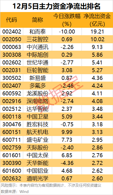和而泰、新易盛和中兴通讯尾盘主力资金分别净流出1.99亿元、1.18亿元、1.04亿元,居前列。