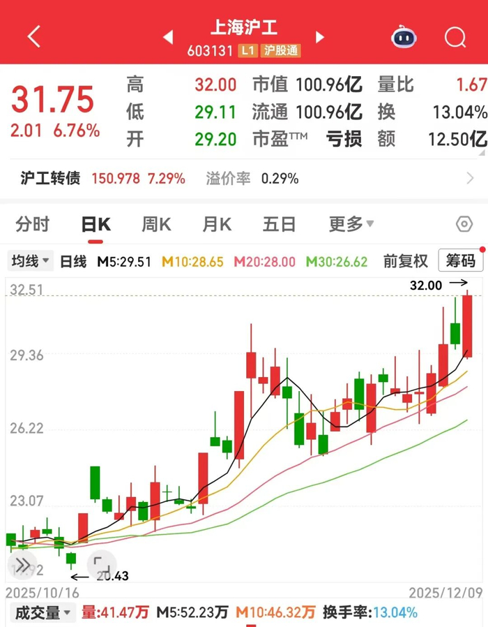 12月9日上午临近收盘时,上海沪工(603131)股价突然大涨,短短7分钟内涨幅由不到1%,最高拉升至7.6%。该股属于商业航天、卫星导航双重概念。公司控股企业沪航卫星业务覆盖卫星及相关产品研发、设计、制造、销售及租赁,与航天单位、上海卫星工程研究所下属企业建立合作关系。