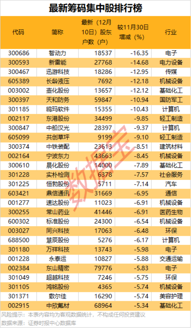 股东户数降幅最多的是智动力,截至12月10日最新股东户数为18537户,较11月30日下降16.35%;其次是新雷能,最新股东户数为27768户,较11月30日下降14.68%,股东户数降幅居前的还有迅游科技、长岭液压、壶化股份等。
