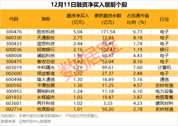 具体到个股,12月11日获融资净买入千万元以上的有377只,其中14只融资净买入额超1亿元。胜宏科技融资净买入额居首,当日净买入5.04亿元;其次是天通股份、蓝思科技,融资净买入金额分别为2.75亿元、2.44亿元;融资净买入金额居前的还有招商银行、澜起科技、香农芯创等。