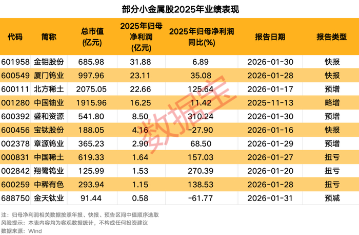 据证券时报·数据宝统计,截至2月12日,已有16只小金属概念股发布2025年业绩相关报告,以快报数据或预告中值统计,金钼股份、厦门钨业、北方稀土、中国铀业归母净利润规模在10亿元以上,依次为31.88亿元、23.11亿元、22.66亿元、16.25亿元。