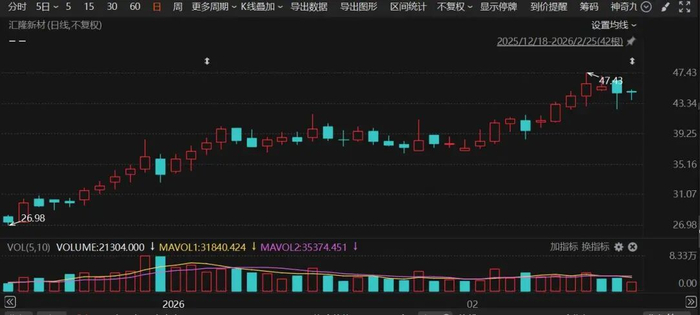 从股价表现上看,汇隆新材2025年内累计涨幅超过190%,2026年以来上涨24.34%。截至2026年2月25日,汇隆新材报44.91元/股,总市值52.53亿元。