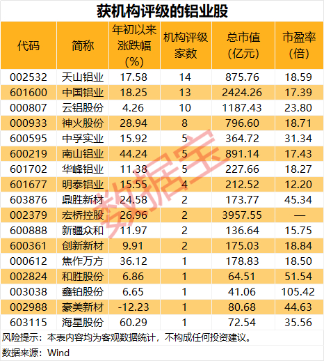 据证券时报·数据宝统计,A股中属于铝行业的上市公司共有31家,年初以来平均上涨12.7%,海星股份、南山铝业、怡球资源、焦作万方累计涨幅均超过30%。