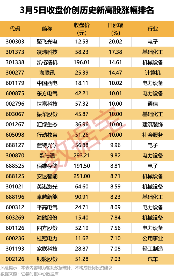 收盘价创历史新高股中,今日股价平均上涨6.42%,涨停的有聚飞光电、中国西电、东方电气等,涨幅居前的有凌玮科技、凯格精机、海联讯等。