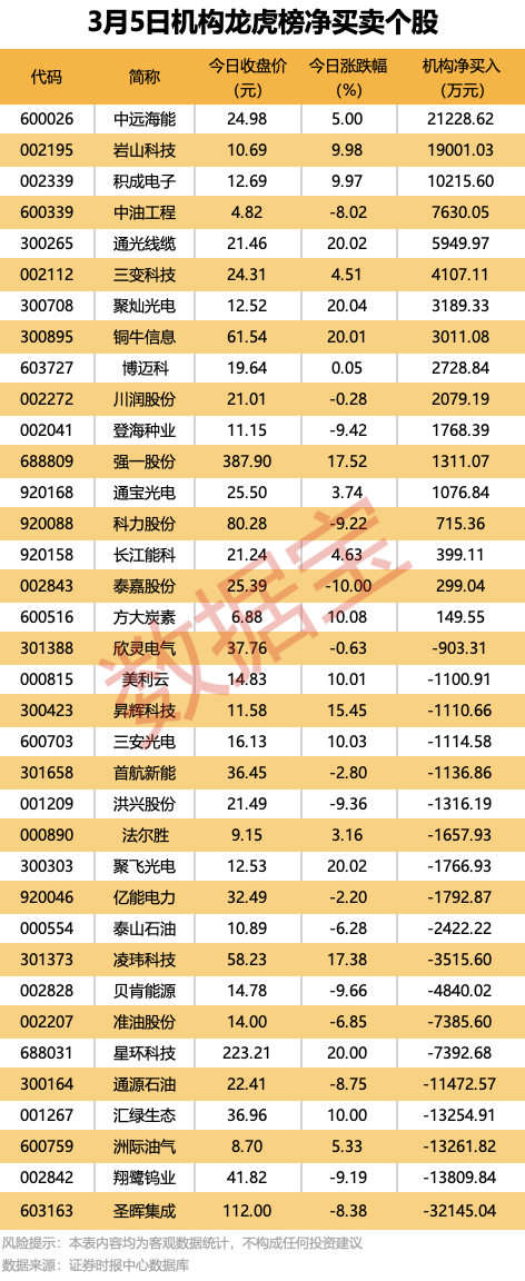 今日龙虎榜中,净买入个股有17只,净卖出的个股为19只。13股净买入金额均超千万元,中远海能获机构净买入2.12亿元,居首;其次是岩山科技,机构净买入金额为1.9亿元。