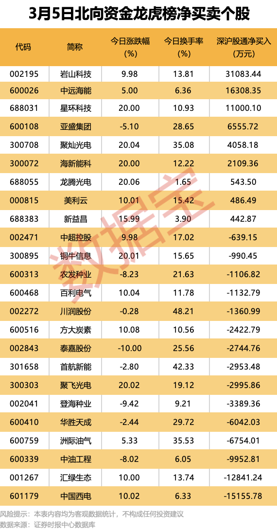 今日龙虎榜现身个股中,9股获北向资金净买入。净买入居首的是岩山科技,金额为3.11亿元;中远海能获北向资金净买入1.63亿元,居次席。