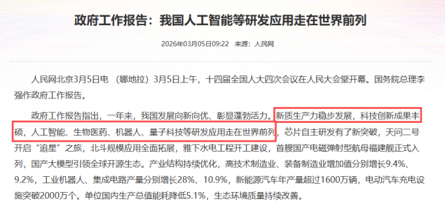 2026年政府工作报告指出,新质生产力稳步发展,科技创新成果丰硕,人工智能、生物医药、机器人、量子科技等研发应用走在世界前列,其中工业机器人产量同比增长28%。