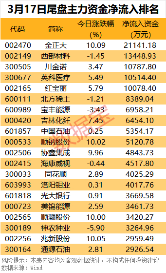 西部材料、川金诺、英科医疗、红宝丽尾盘也获主力资金抢筹,均超1亿元。