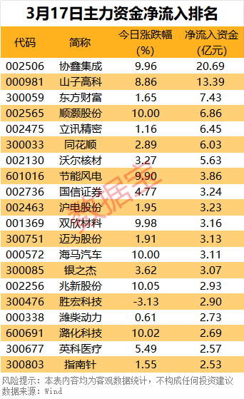 山子高科净流入13.39亿元,股价大涨超8%。东方财富、顺灏股份、立讯精密、同花顺、沃尔核材净流入资金均超5亿元。