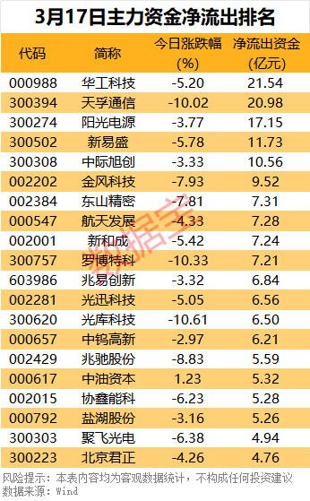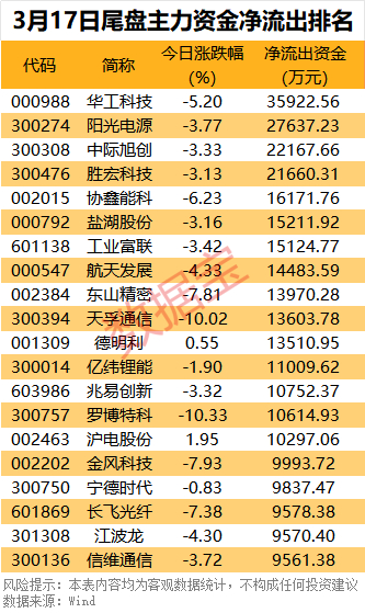 华工科技尾盘主力资金净流出仍居首,达到3.59亿元;阳光电源、中际旭创、胜宏科技尾盘净流出金额均超2亿元。