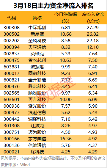 算力个股获主力资金追捧,中际旭创、新易盛、天孚通信净流入均超10亿元,英维克、香农芯创、数据港、网宿科技、胜宏科技等净流入均超6亿元。