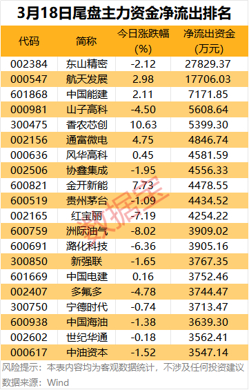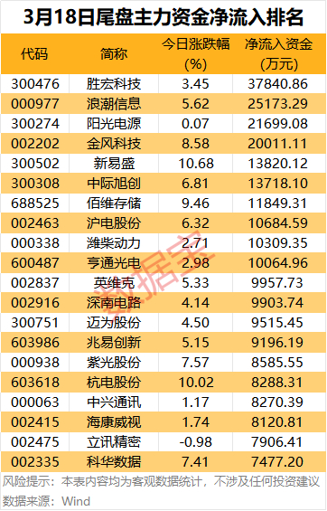 此外,浪潮信息、阳光电源、金风科技尾盘主力资金净流入超2亿元。