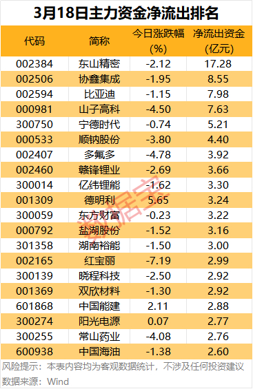 东山精密净流出居首,达到17.28亿元,今日股价盘中一度跌超7%,协鑫集成、比亚迪、山子高科、宁德时代净流出资金超5亿元。