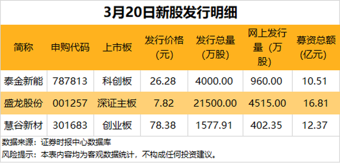 今日(3月20日)共有3只新股集中发行,分别是科创板的泰金新能、深市主板的盛龙股份、创业板的慧谷新材。