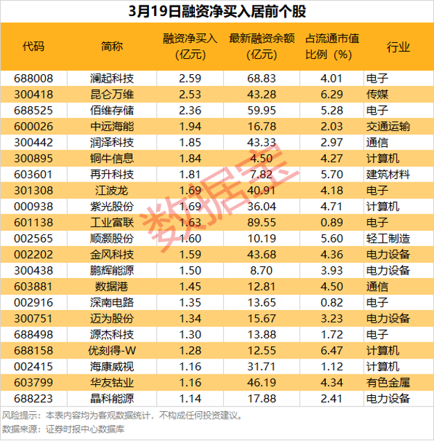 澜起科技融资净买入额居首,当日净买入2.59亿元;其次是昆仑万维、佰维存储,融资净买入金额分别为2.53亿元、2.36亿元。融资净买入金额居前的还有中远海能、润泽科技、铜牛信息等。