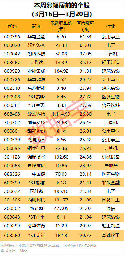 据证券时报·数据宝统计,个股方面,本周超580股上涨,26股涨幅在20%及以上。其中,涨幅最大的是电力股华电辽能,本周累计上涨61.34%;深华发A也涨超61%,朗科科技、大胜达本周累计涨幅均在30%以上。