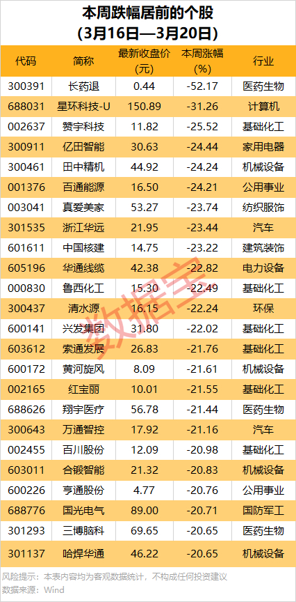 本周累计下跌的个股中,超700股跌幅在10%以上,长药退一周累计跌52.17%,居首;星环科技-U、赞宇科技、亿田智能等累计跌幅均超20%。