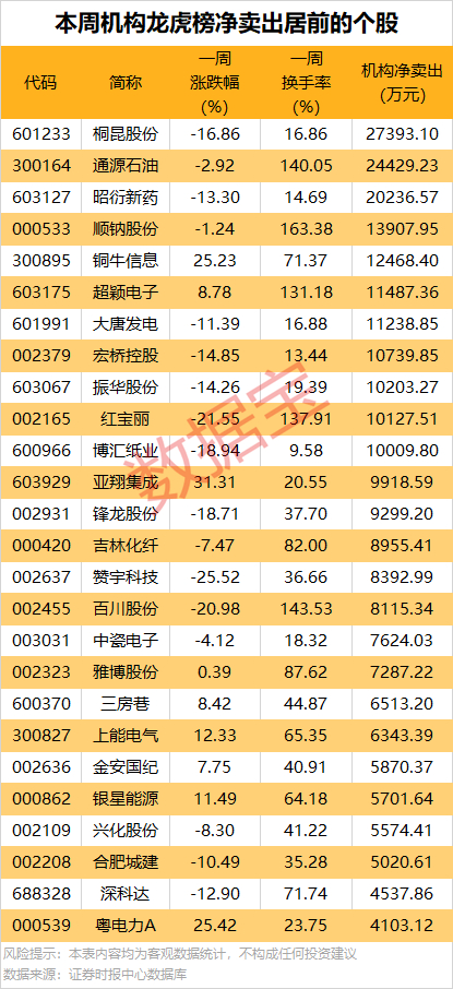 一周机构累计净卖出的个股中,11股金额均超1亿元,其中净卖出金额最多的是桐昆股份,该股本周累计下跌16.86%,一周换手率为16.86%,因日跌幅偏离值达7.58%等1次上榜龙虎榜,买卖居前营业部中机构合计净卖出2.74亿元。