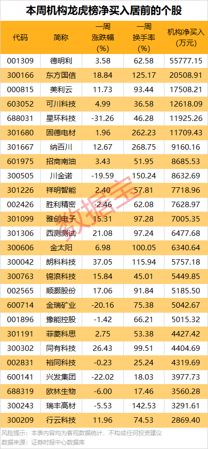 龙虎榜数据显示,本周机构专用席位共现身112股龙虎榜,净买入47股,净卖出65股。其中,33股获机构净买入均超千万元,德明利、东方国信等6股机构净买入金额均超1亿元。