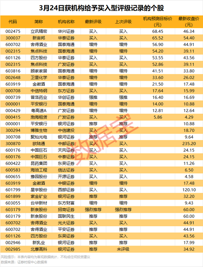 今日获机构给予买入型评级的个股中,共有14条评级记录给出了预测目标价。以公布的预测目标价与最新收盘价进行对比显示,10股上涨空间均超20%。
