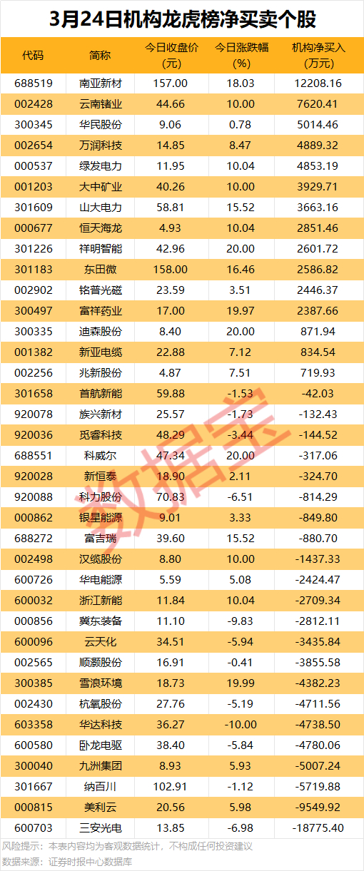 今日龙虎榜中,净买入个股有15只,净卖出的个股为22只。12股净买入金额均超2000万元,南亚新材获机构净买入1.22亿元,居首;其次是云南锗业、华民股份,机构净买入金额均超5000万元。