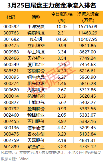 个股方面,平潭发展、锦浪科技、N宏明尾盘主力资金大幅净流入金额均超1亿元。