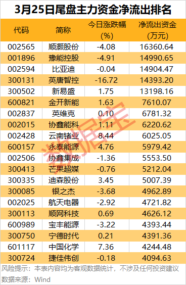尾盘主力资金净流出方面,顺灏股份、豫能控股、比亚迪、英唐智控、新易盛尾盘主力资金净流出均超1亿元。