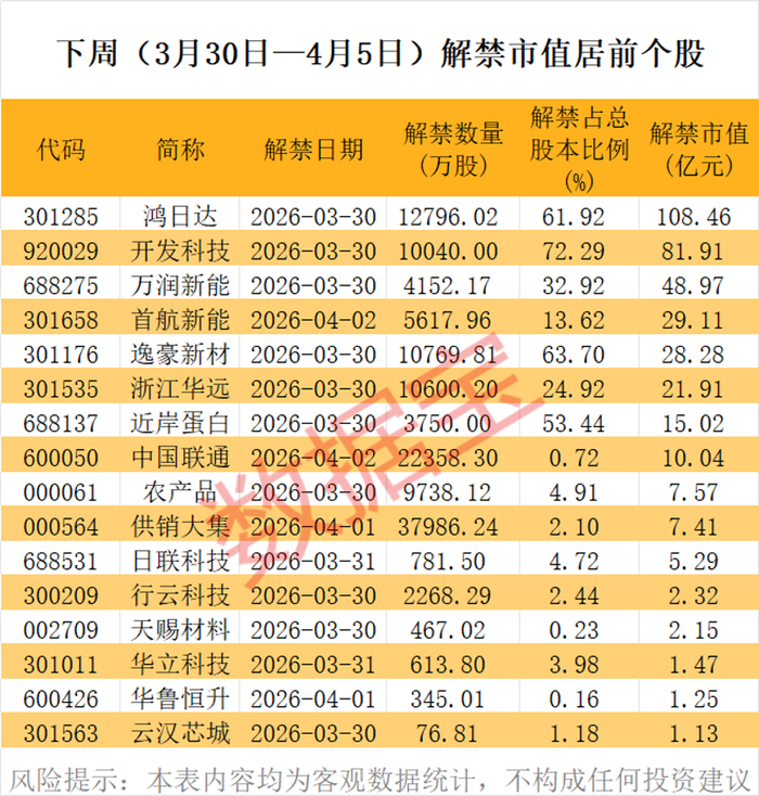 下周(3月30日—4月5日)将有29股解禁。