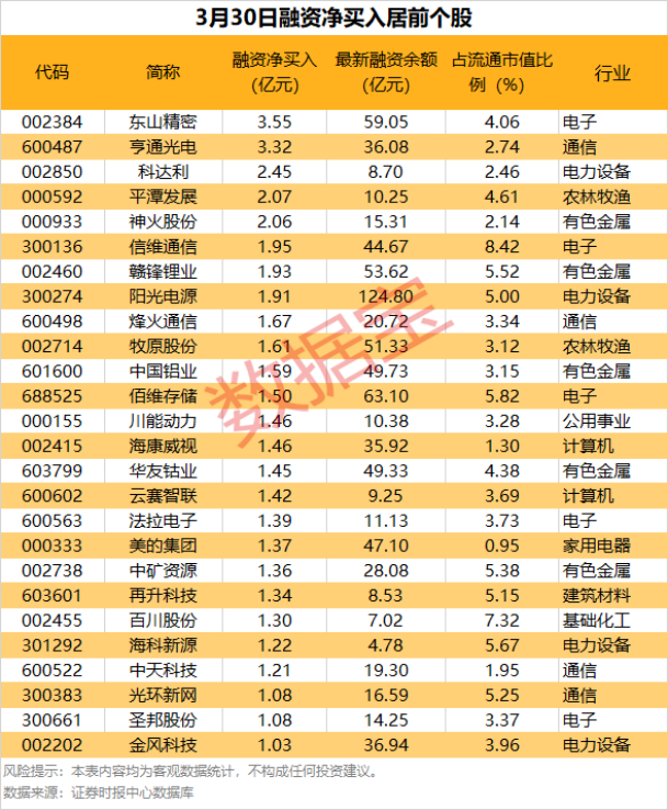 具体到个股,3月30日共有1872只股获融资净买入,净买入金额在千万元以上的有473只,其中26只融资净买入额超1亿元。东山精密融资净买入额居首,当日净买入3.55亿元;其次是亨通光电、科达利,融资净买入金额分别为3.32亿元、2.45亿元,融资净买入金额居前的还有平潭发展、神火股份、信维通信等。