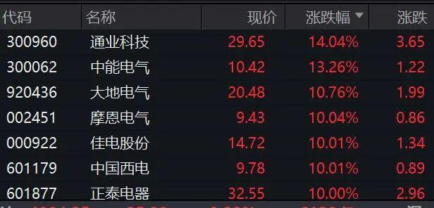 电网设备、特高压、超临界发电、核电核能等板块也纷纷创历史新高或多年新高,摩恩电气、中国西电、顺钠股份、太阳电缆等批量涨停。